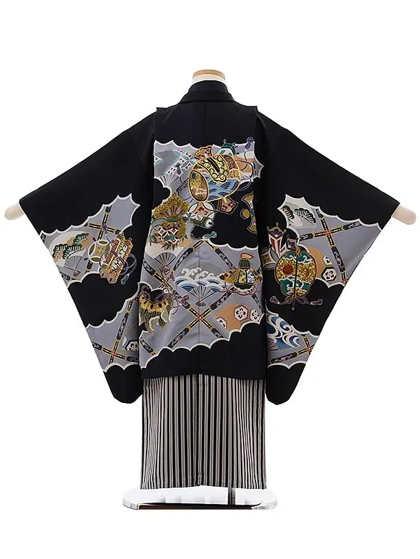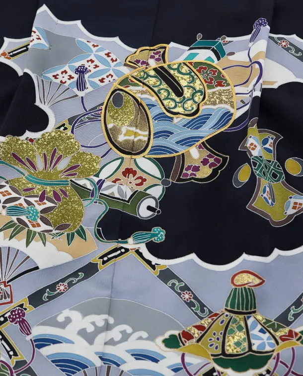 七五三(5歳男児袴)5468 (正絹)手描き友禅 紺地 小槌×黒白縞袴