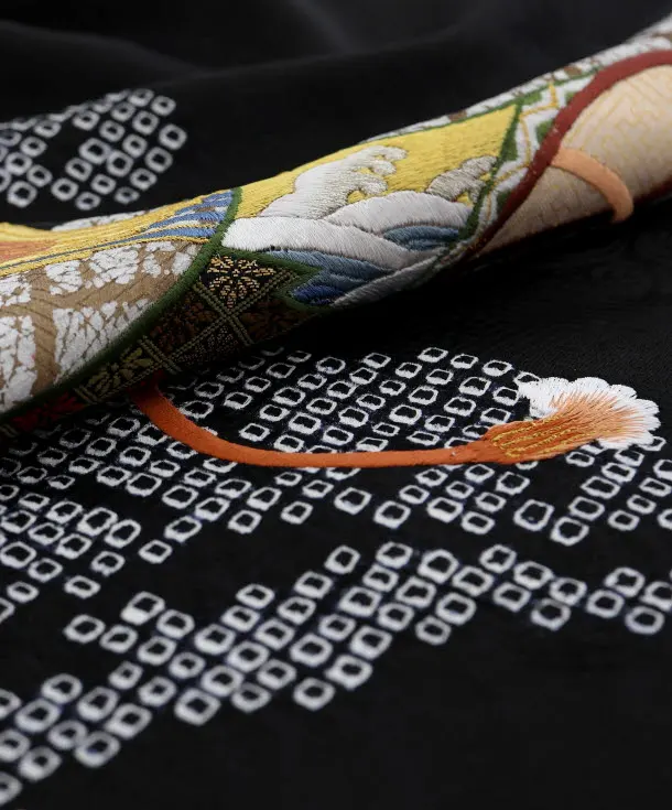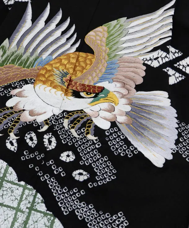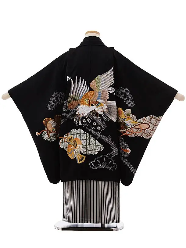 七五三(5歳男児袴)5470 (高級正絹) 黒地 鷹刺繍×黒白縞袴
