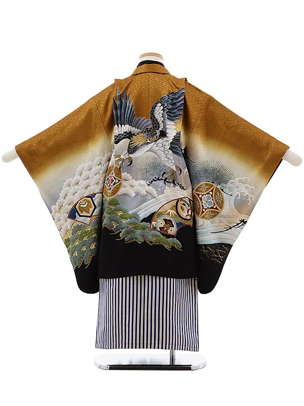 七五三レンタル(5歳男児袴) 5491 (正絹) 金茶ぼかし鷹×紺縞袴
