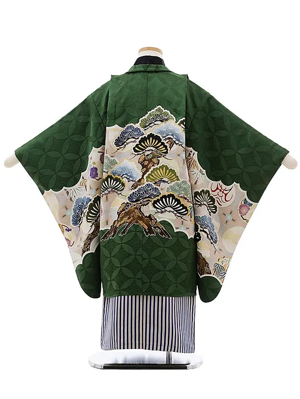 七五三(5歳男児袴)5492 (高級正絹) グリーン地松に隈取×紺縞袴