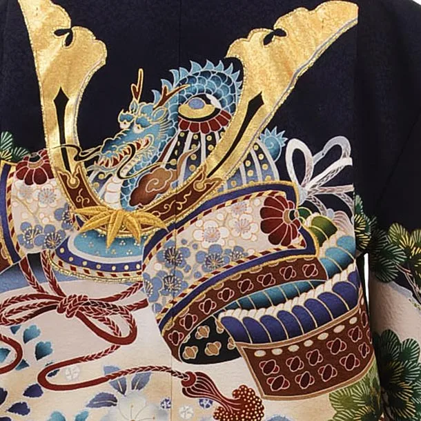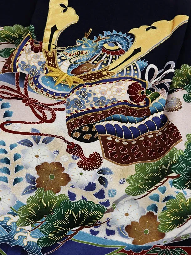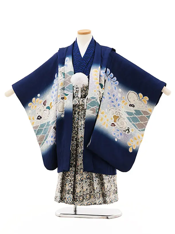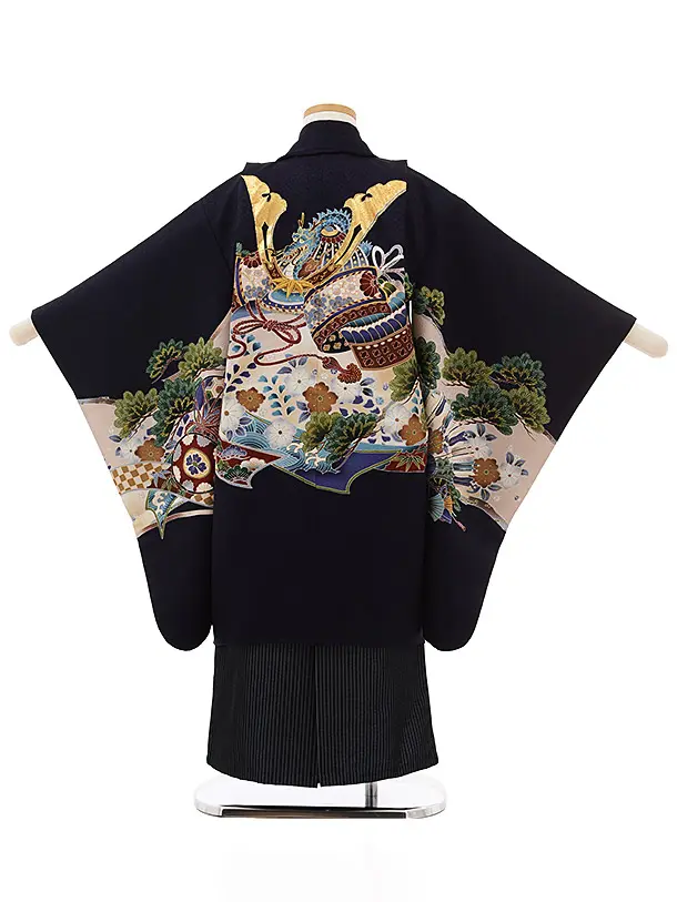 七五三レンタル(5歳男袴) 5504茄子紺松かぶと(羽織 着物正絹)x黒縞袴