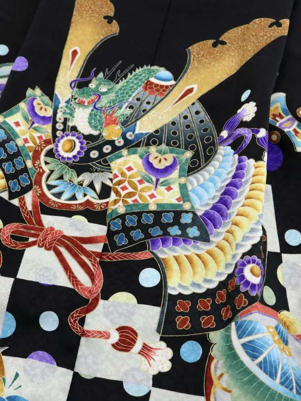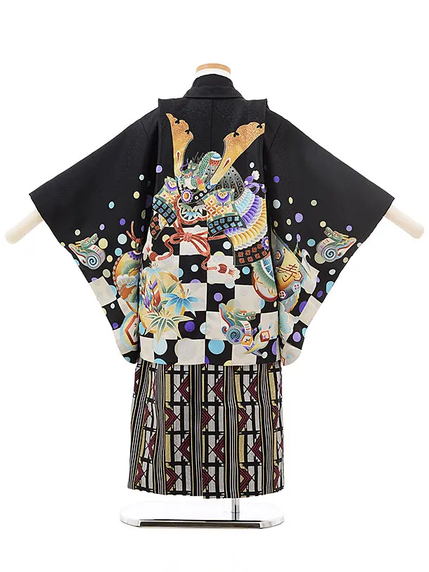 七五三レンタル(4.5歳男袴)5506 黒地 市松 かぶと×黒シルバー袴