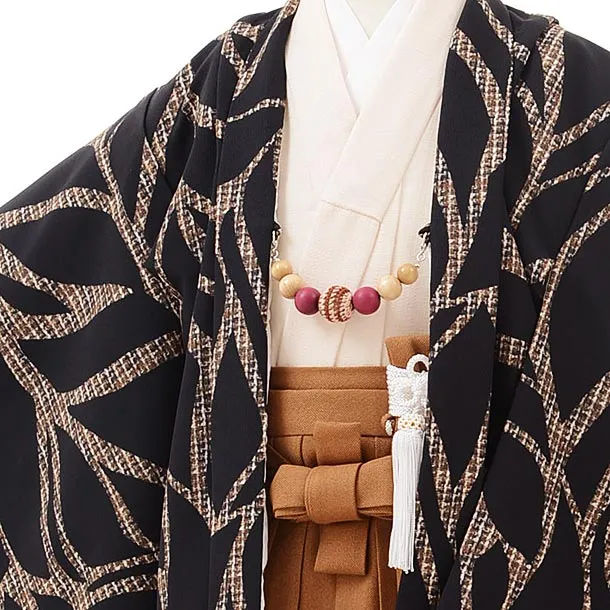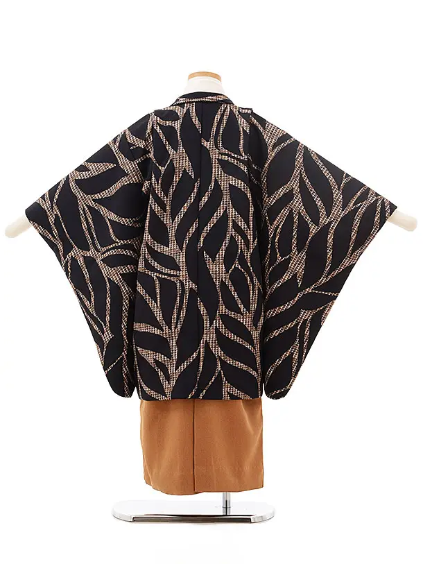 七五三レンタル(5歳男児袴)5527ラフィネココ黒地リーフ×キャメル袴