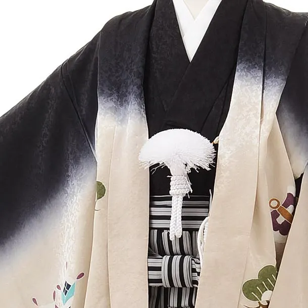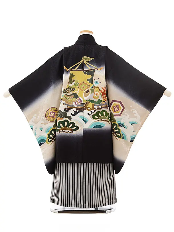 七五三レンタル(5歳男児袴)5551(正絹)黒地宝舟×黒縞袴