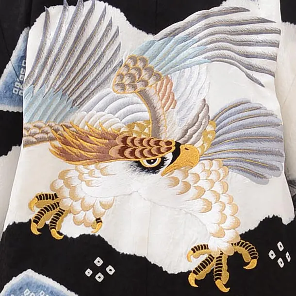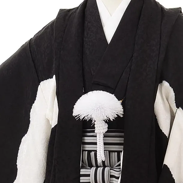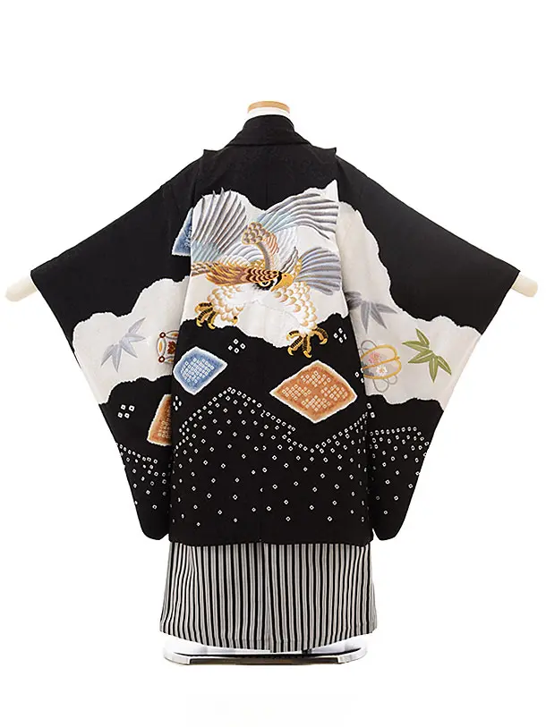 七五三レンタル(5歳男児袴)5552(正絹)黒地 刺繍 鷹×黒縞袴