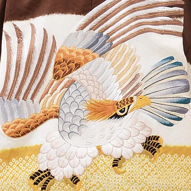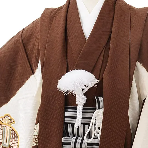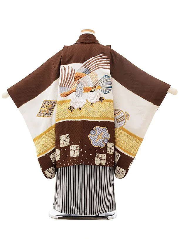 七五三レンタル(5歳男児袴)5553(正絹)茶色 絞り刺繍鷹×黒縞袴