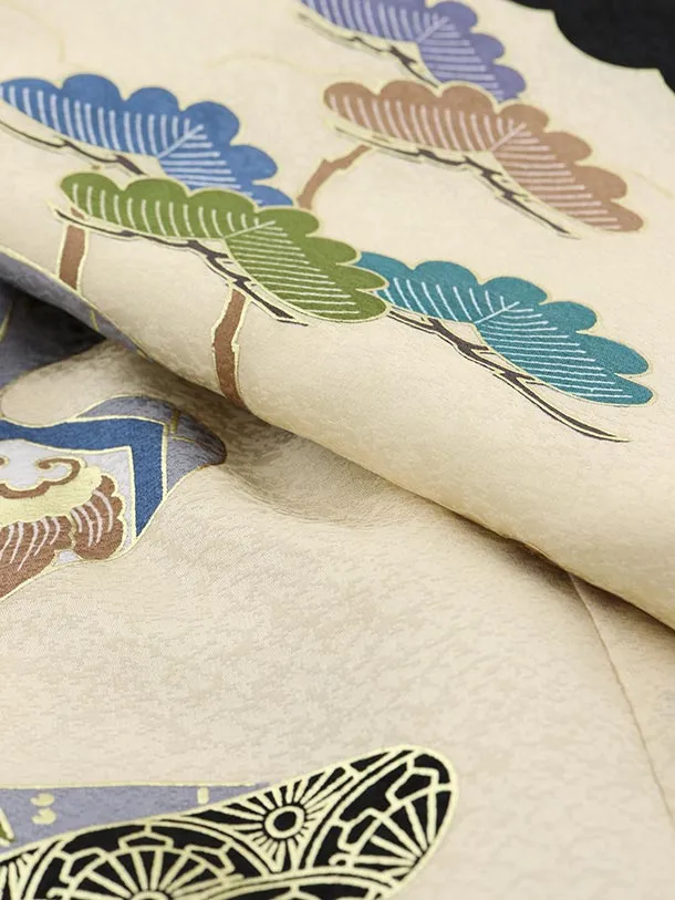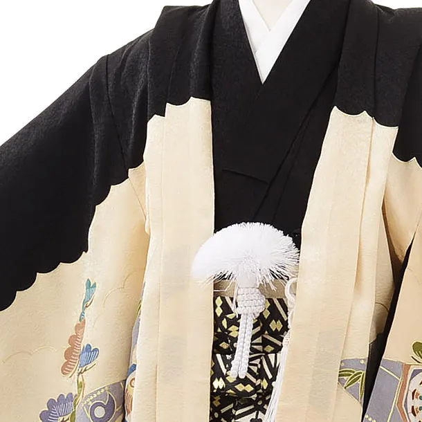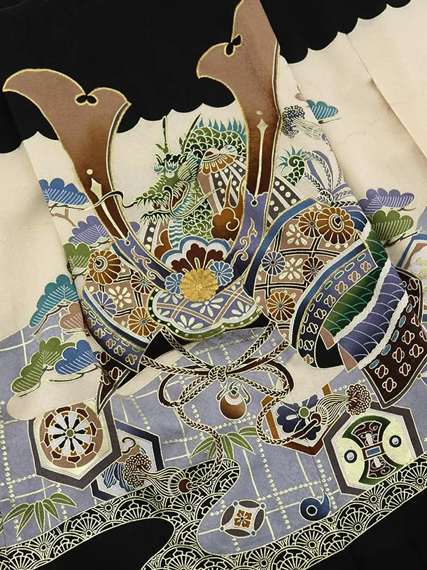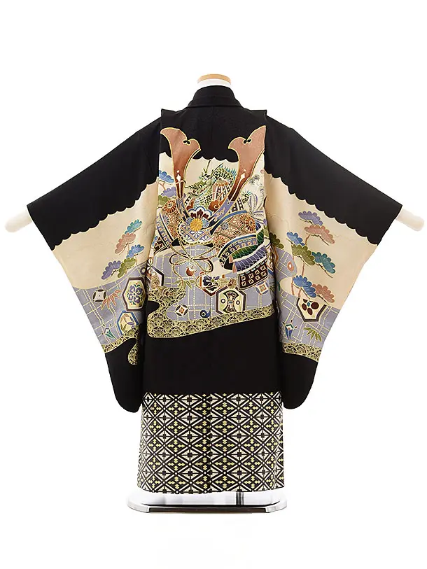 七五三レンタル(5歳男児袴)5559(正絹)黒地松に兜×黒ゴールド袴