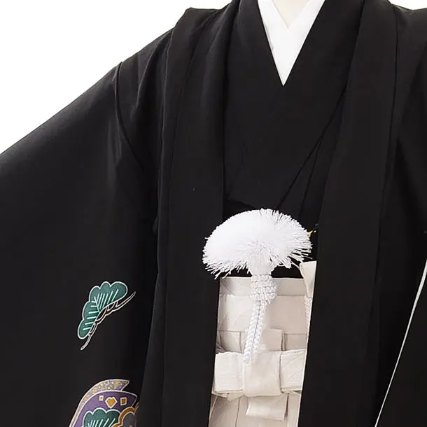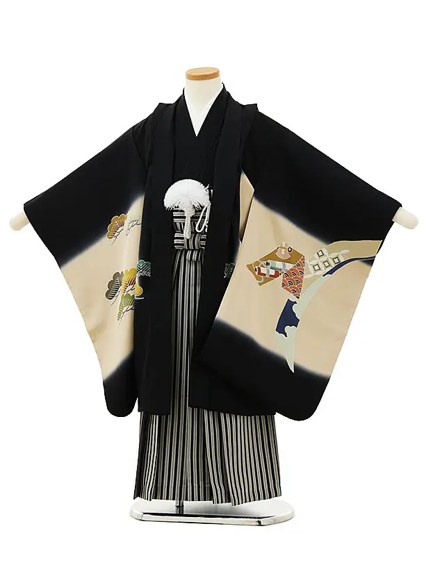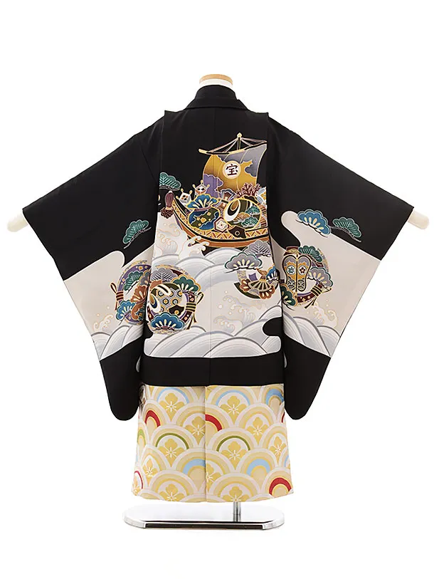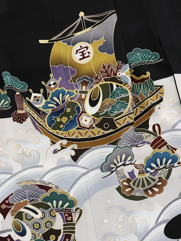 七五三レンタル(5歳男児袴)5562(正絹)黒地波に宝舟×白波袴