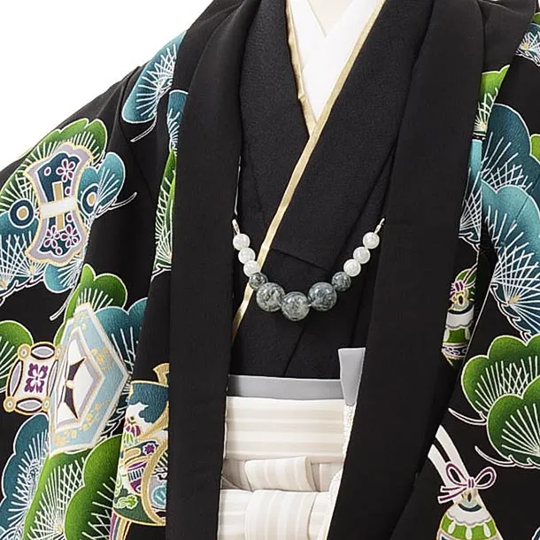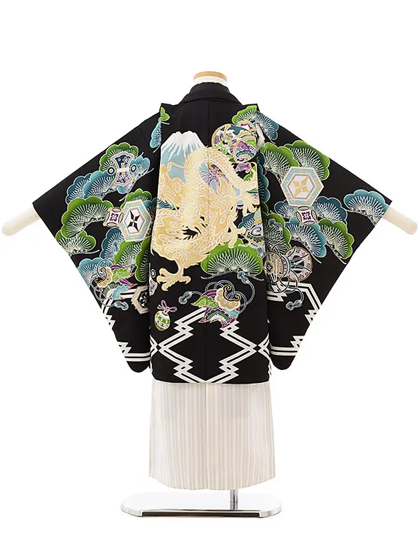 七五三レンタル(5歳男の子袴)5582 黒地松富士に金の龍×白ストライプ袴