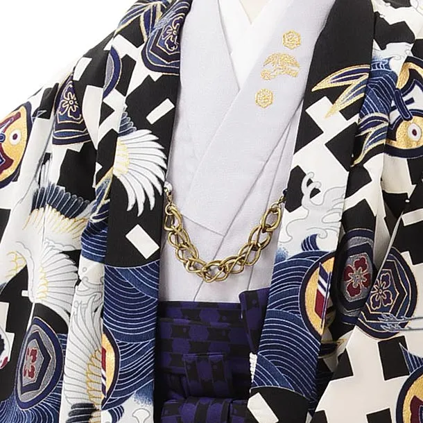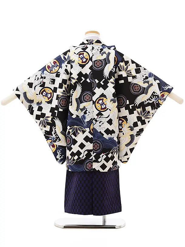 かんたん七五三レンタル(5歳男の子袴)5584 白黒丸紋に波鶴×黒紫袴