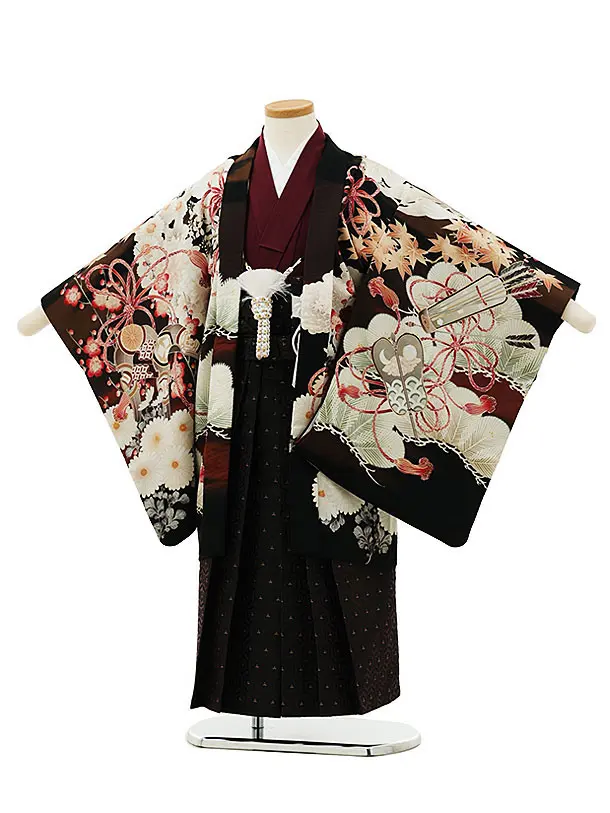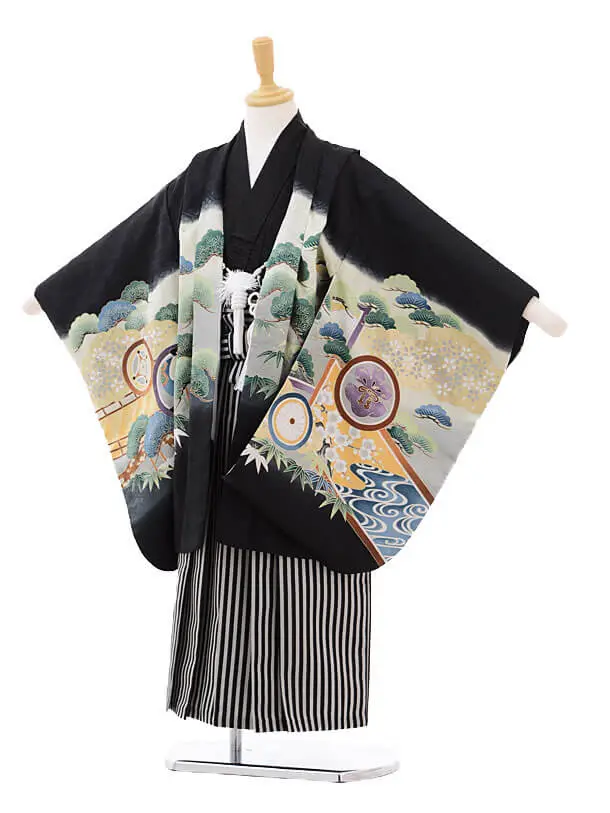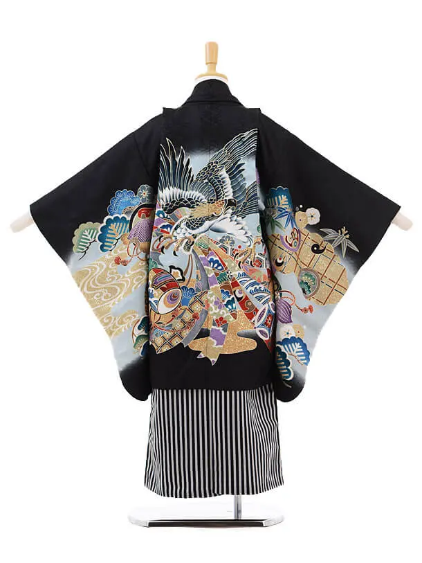 かんたん七五三レンタル(5歳男の子袴)5622黒色鷹にのし×白黒縞袴