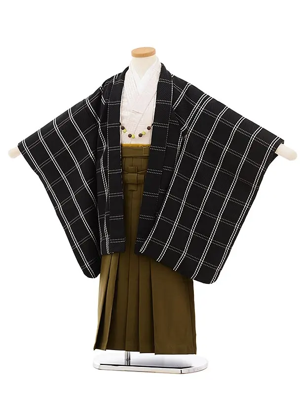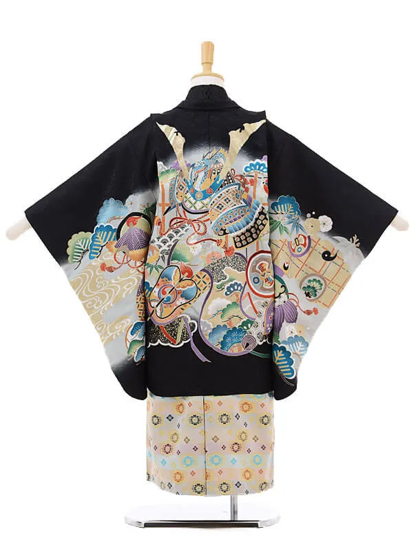 かんたん七五三レンタル(5歳男の子袴)5627黒地かぶとに巻物×白糸袴