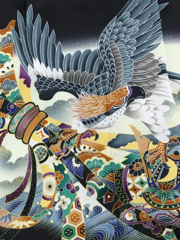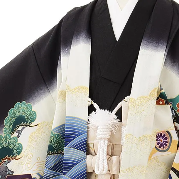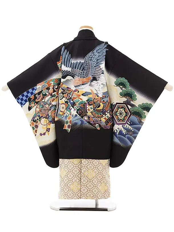 七五三レンタル(5歳男児袴)5654 黒地束ね熨斗鷹×ベージュぼかし菱袴