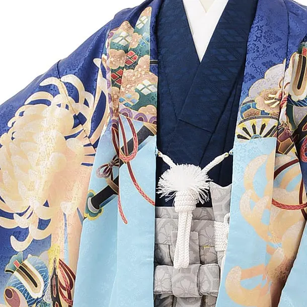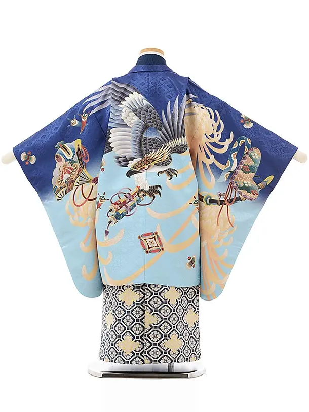 七五三レンタル(5歳男児袴)5657 紺地水色ぼかし乱菊に鷹×グレー紺ぼかし菱袴
