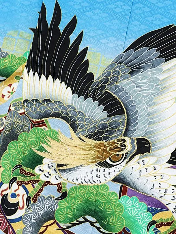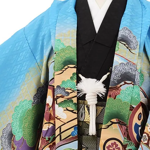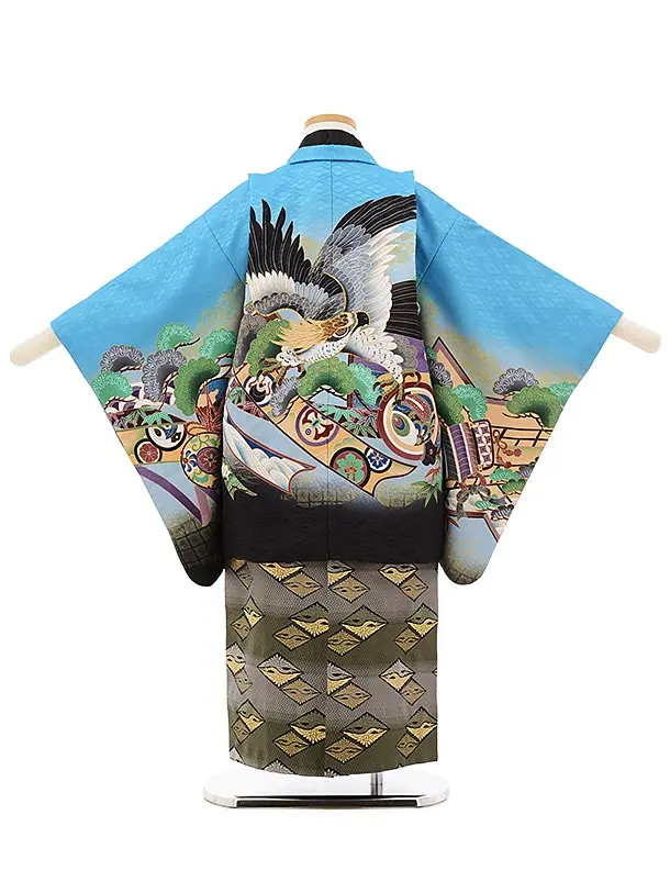 かんたん七五三レンタル(5歳男袴)5666ブルー地裾黒のしに鷹xグリーンぼかし袴