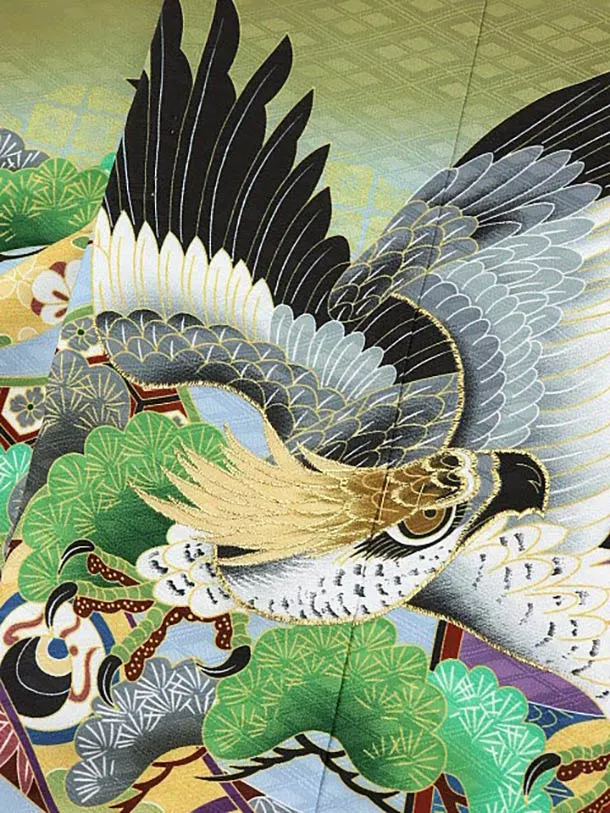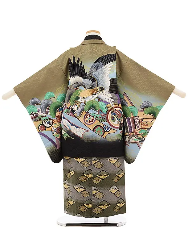 かんたん七五三レンタル(5歳男袴)5667抹茶色裾黒のしに鷹xグリーンぼかし袴