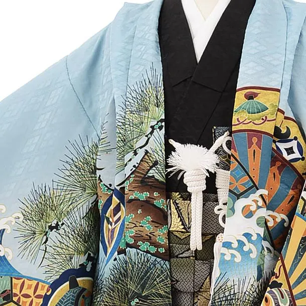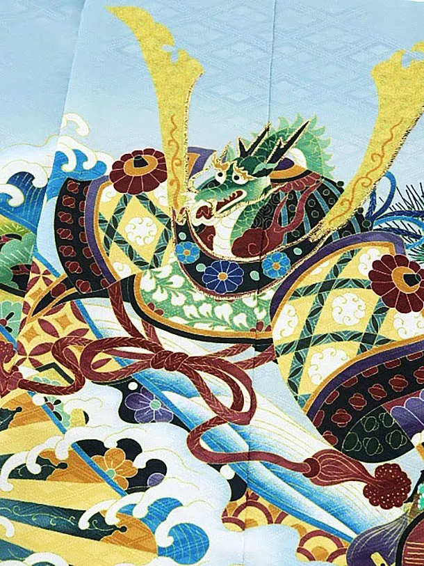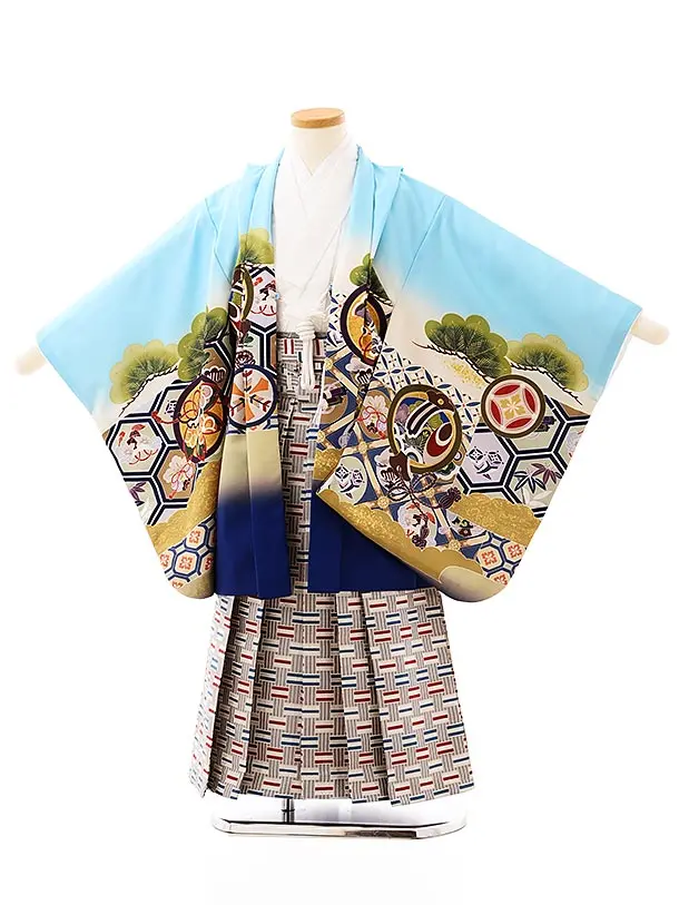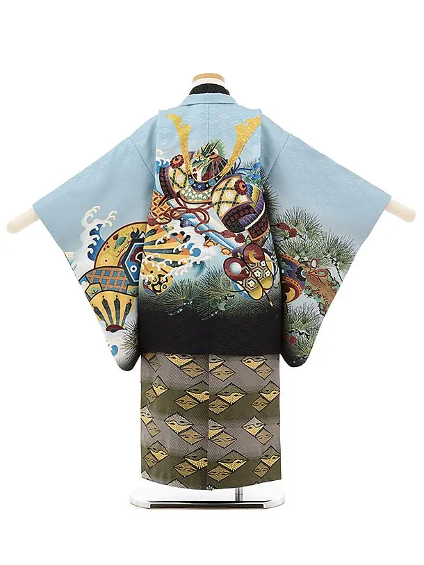 かんたん七五三レンタル(5歳男袴)5669ブルーグレー裾黒兜xグリーンぼかし袴