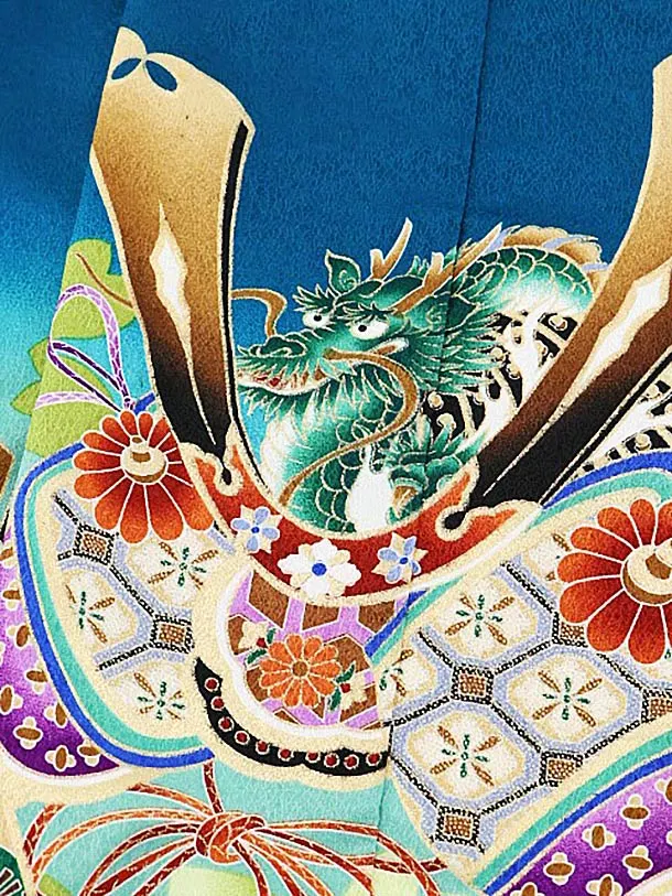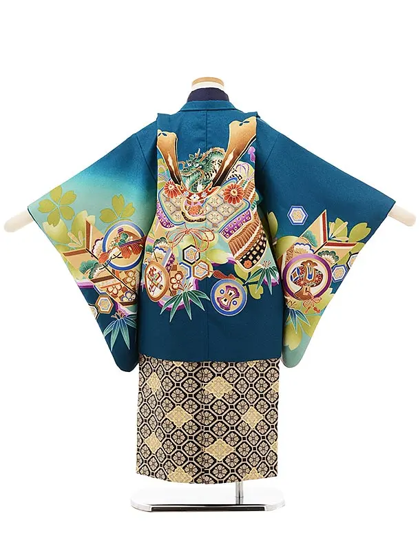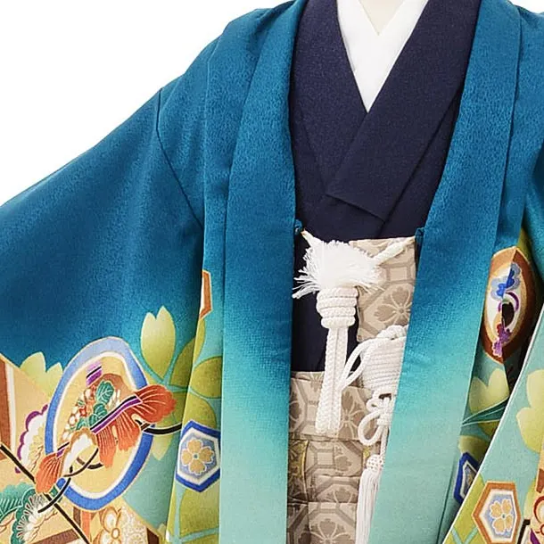 かんたん七五三レンタル(5歳男袴)5672エメラルドグリーンかぶとx黒ぼかし菱袴