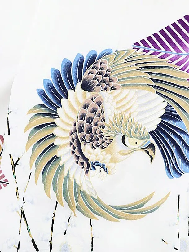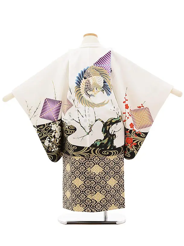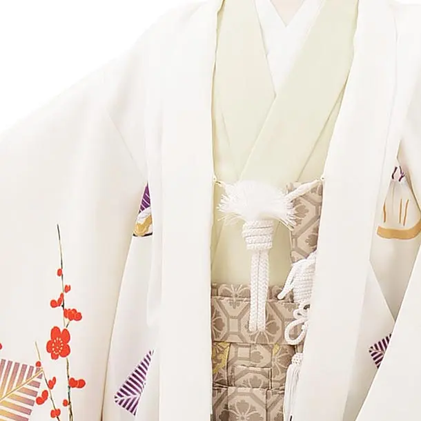 かんたん七五三レンタル(5歳男袴)5673白地紅白梅に鷹x黒ぼかし菱袴