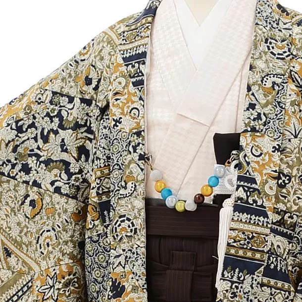 かんたん七五三レンタル(5歳男袴)5679モスグリーンからし更紗文様x茶色袴