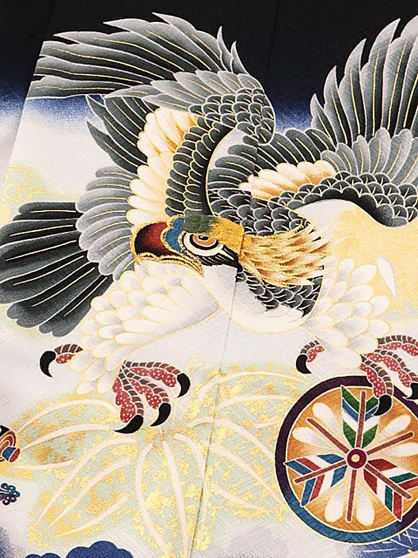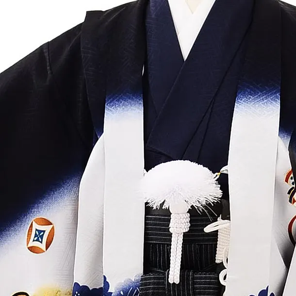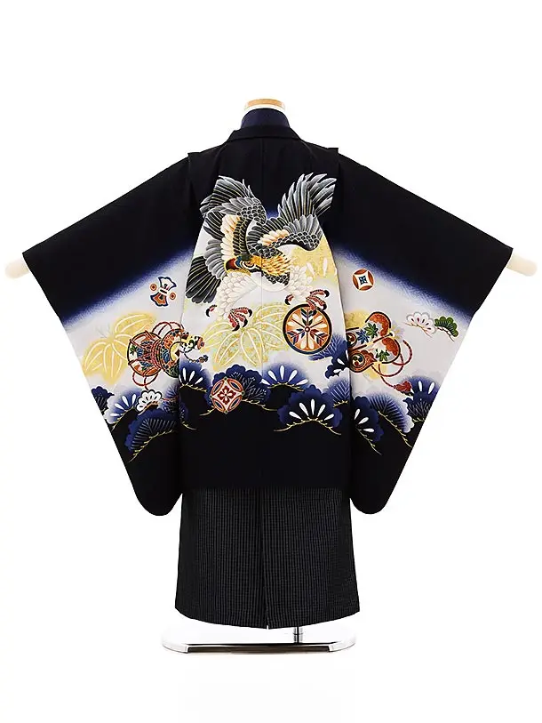 七五三レンタル(5歳男袴)5703濃紺地吉祥文様鷹x紺グレー縞袴