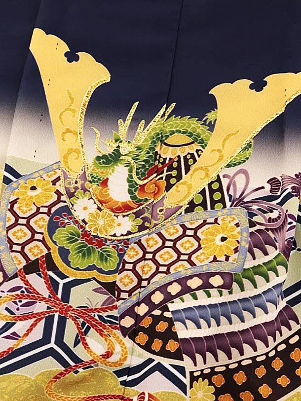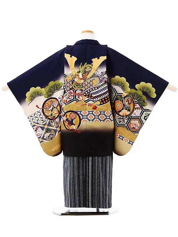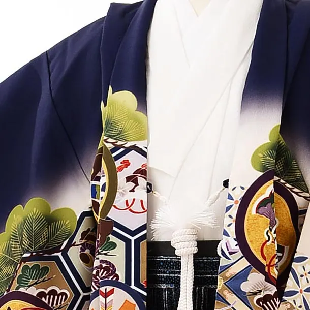 七五三レンタル(5歳男袴)5709紺地亀甲に丸紋かぶとx紺シルバー袴