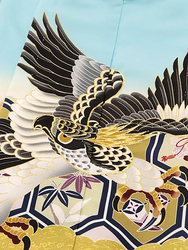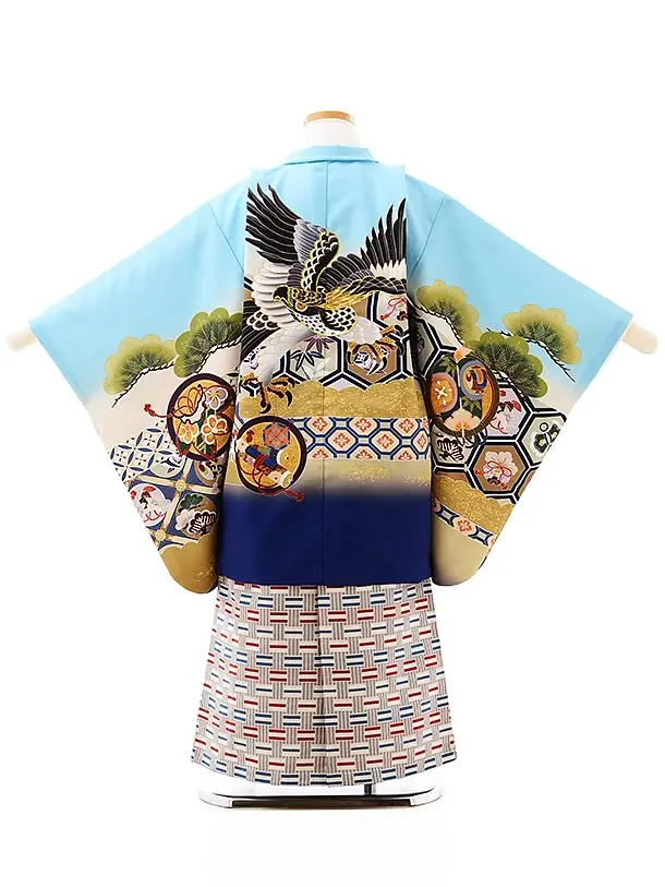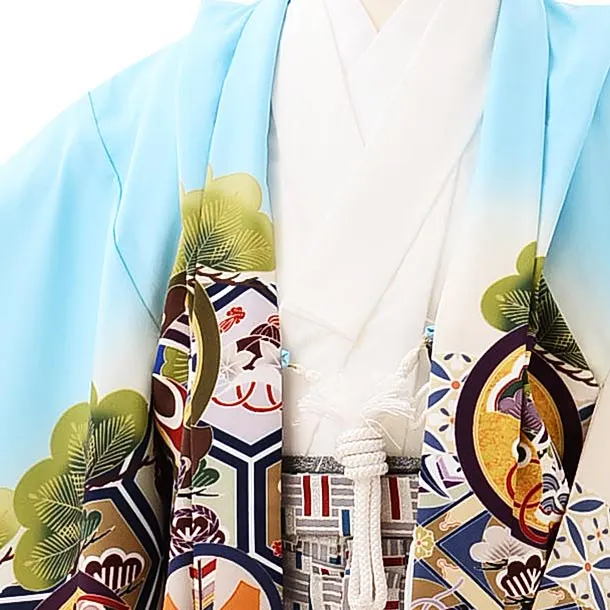 かんたん七五三レンタル(5歳男袴)5719水色亀甲に丸紋鷹xグレー赤ブルー袴
