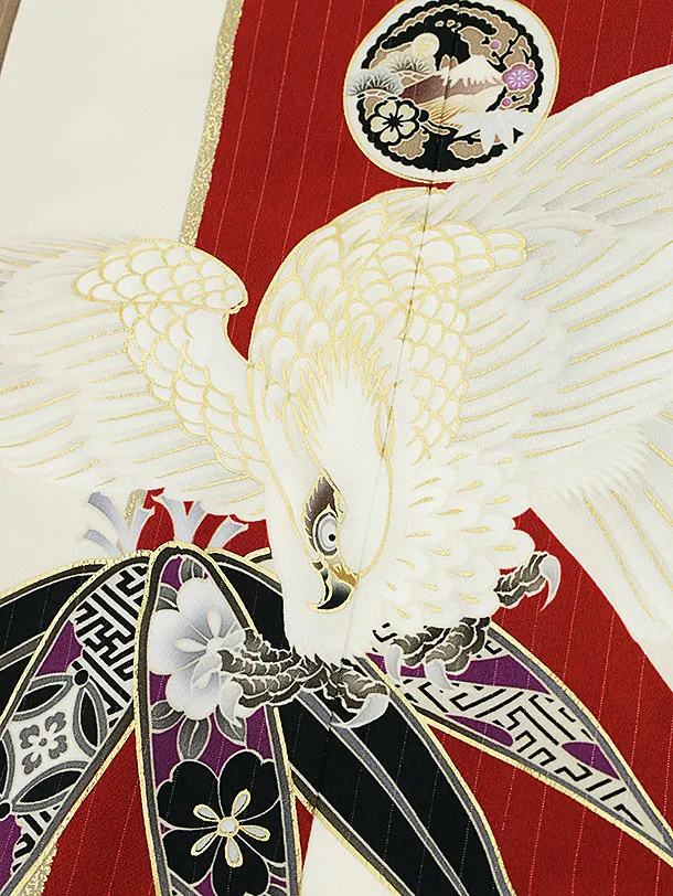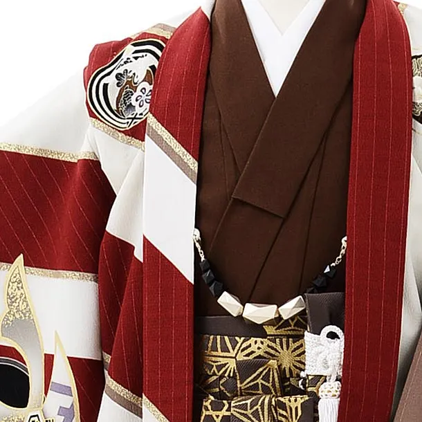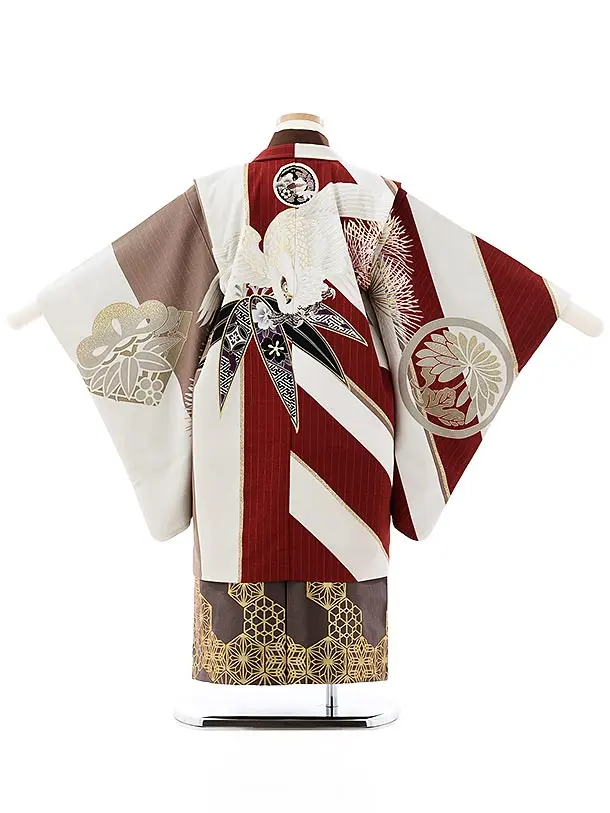 七五三(5歳男袴)5728JAPAN STYLE エンジ白縞鷹x茶色ゴールド袴