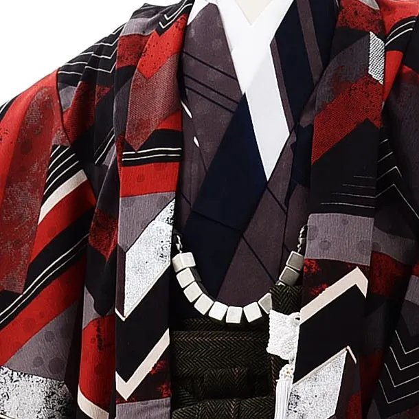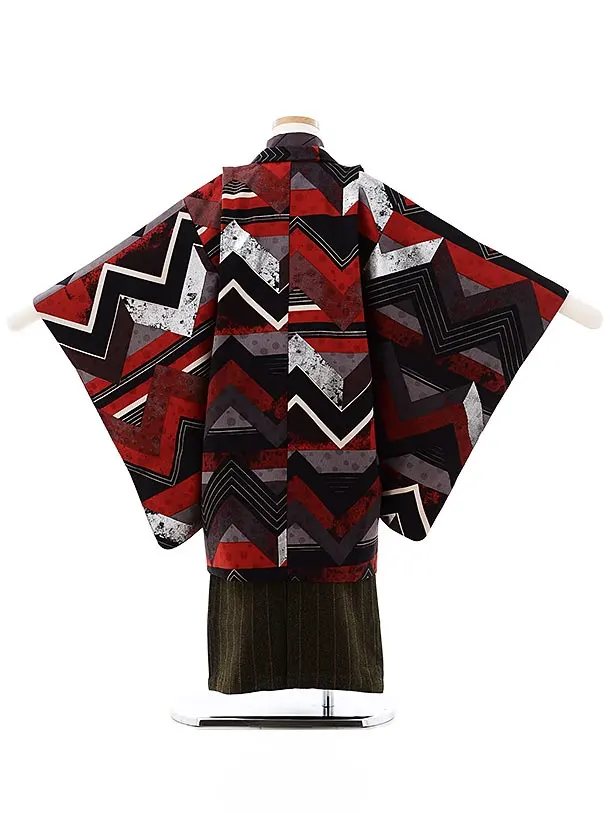 七五三レンタル(5歳男袴)5733モダンアンテナ 黒赤小紋稲妻xグリーン袴