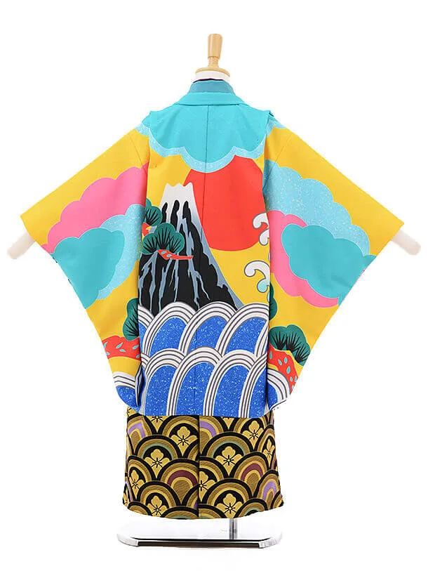 かんたん七五三レンタル(5歳男児袴)5790花わらべ黄グリーン富士に鶴×黒地袴