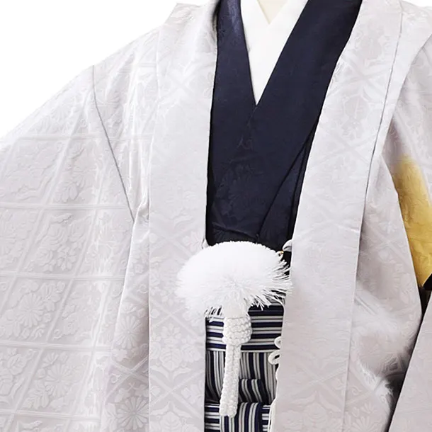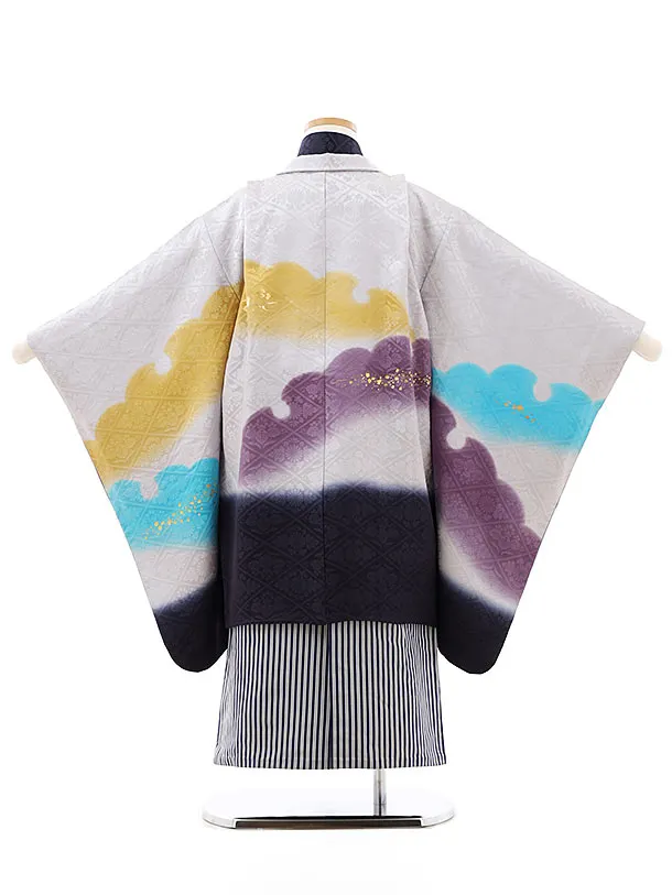 七五三レンタル(5歳男袴)(高級正絹)5814うすグレー地雪輪ぼかしx紺縞袴