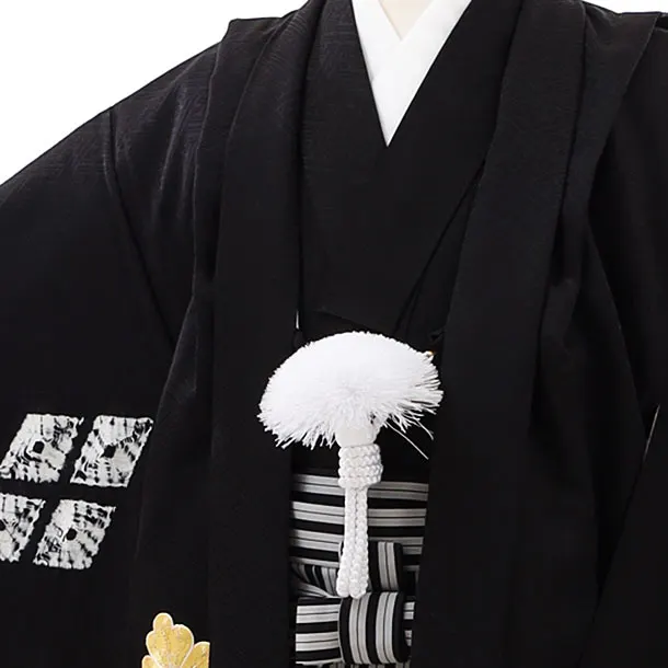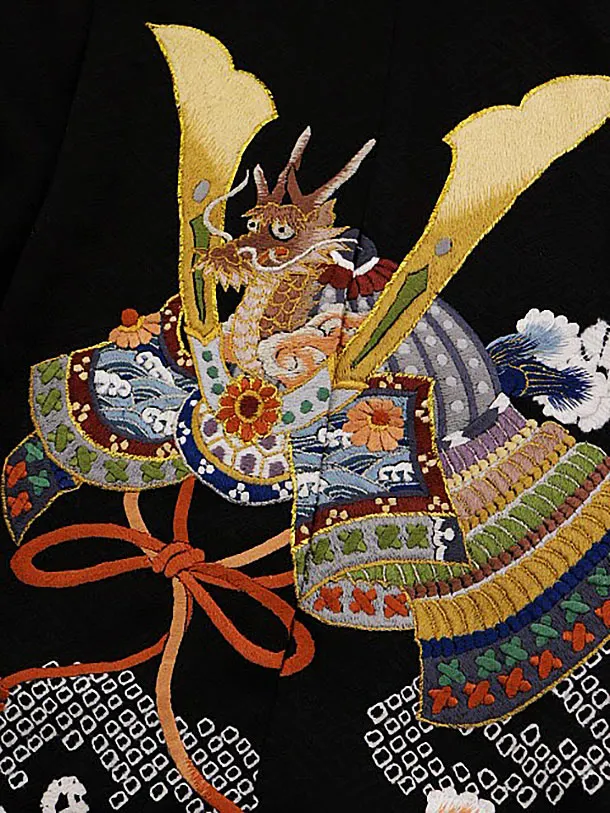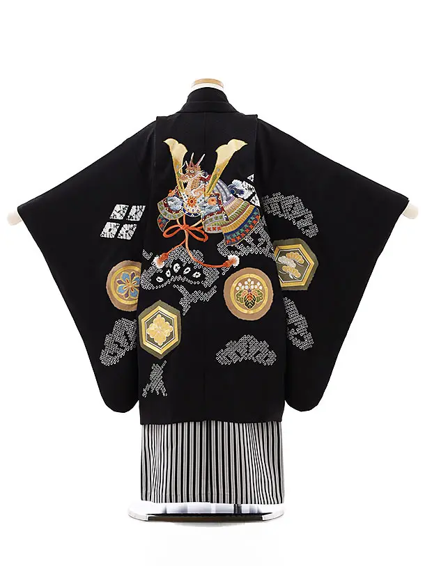 七五三レンタル(5歳男袴)(高級正絹)5818黒地刺繍かぶとx黒白縞袴