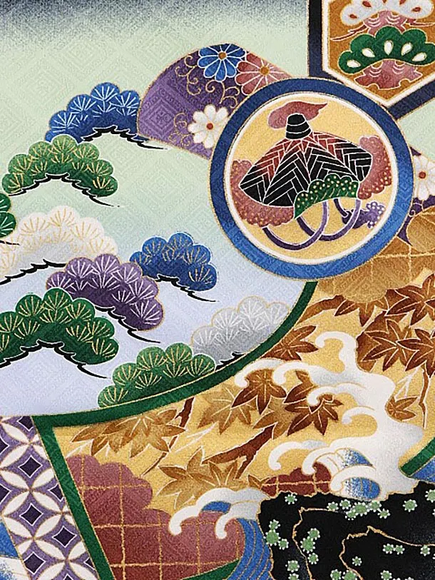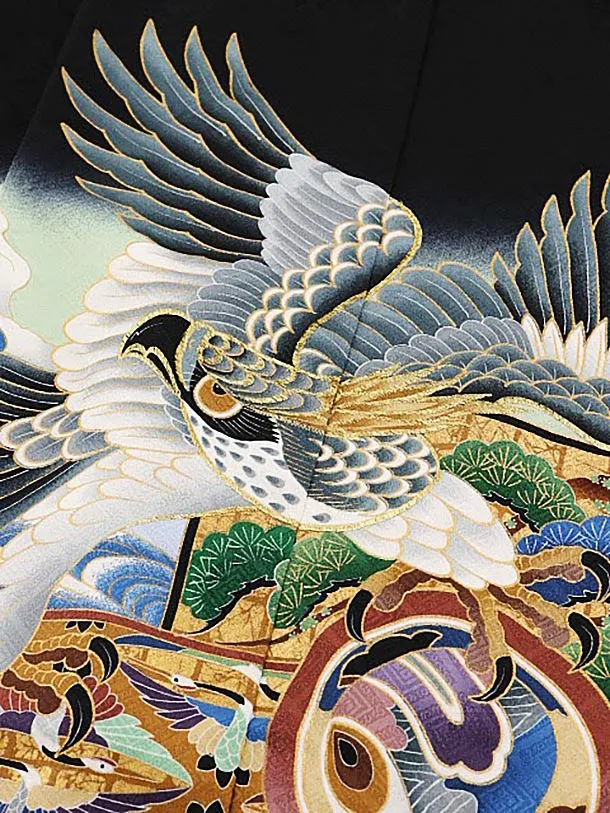 かんたん七五三レンタル(5歳男袴)5828黒地波に丸紋鷹x黒白縞袴