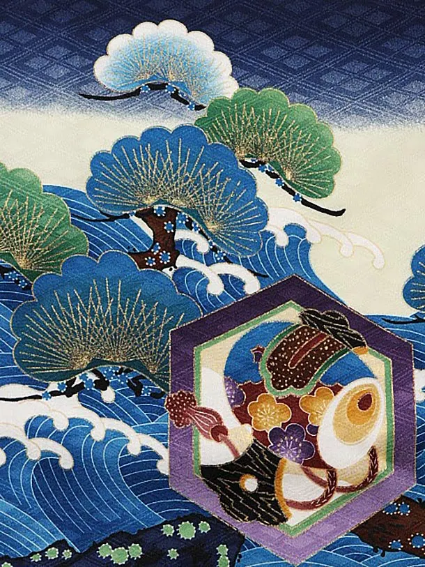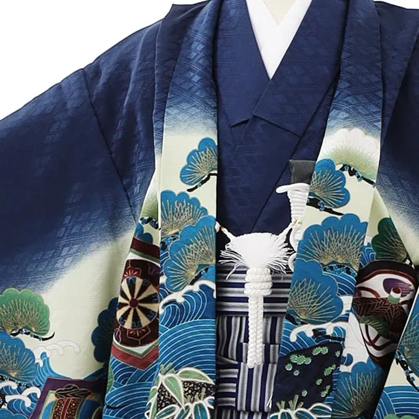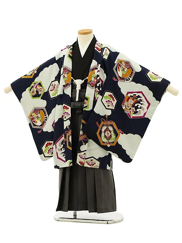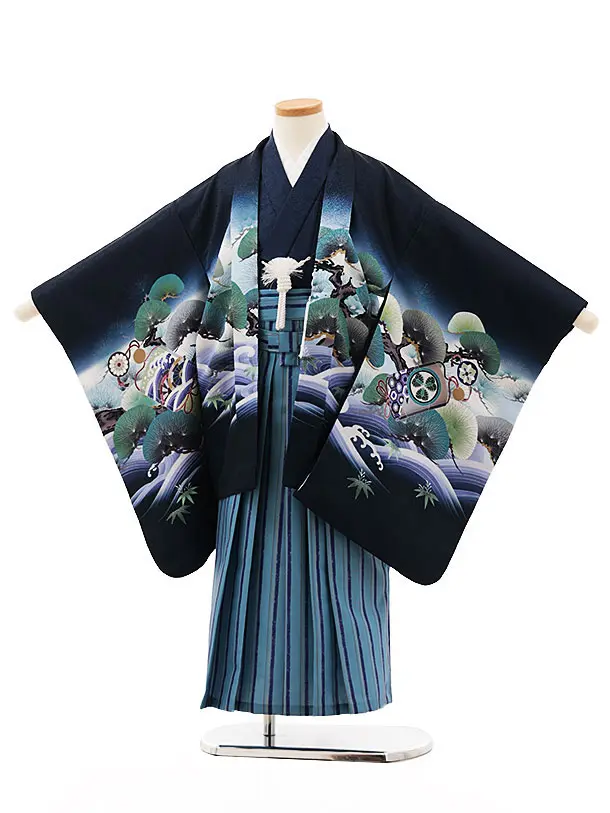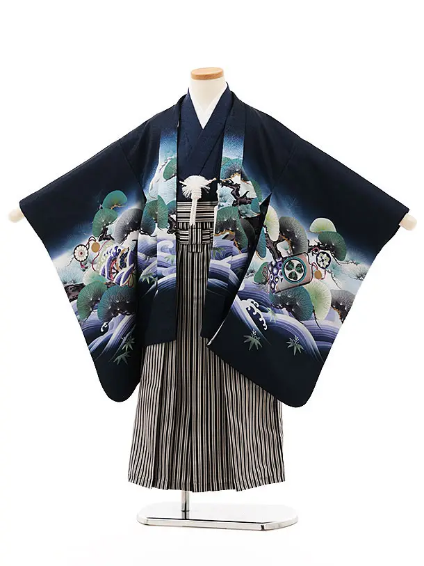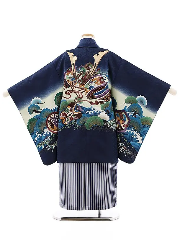 かんたん七五三レンタル(5歳男袴)5830紺地波に松兜x紺縞袴