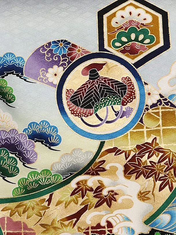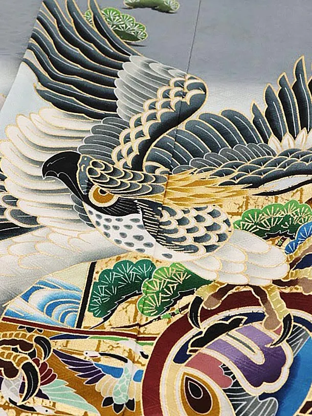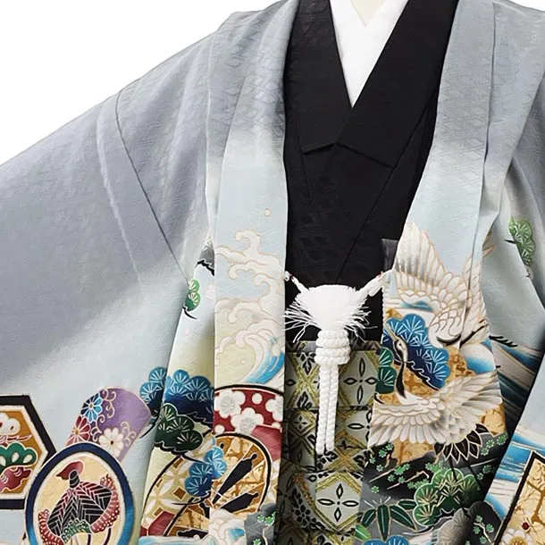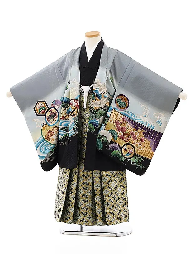 かんたん七五三レンタル(5歳男袴)5831グレー地裾黒波に鷹xグレー菱袴