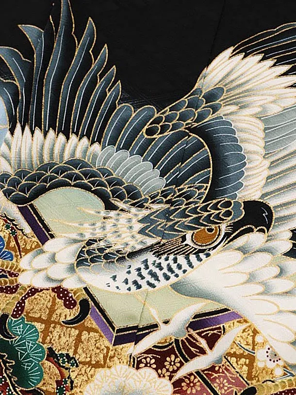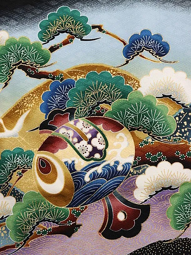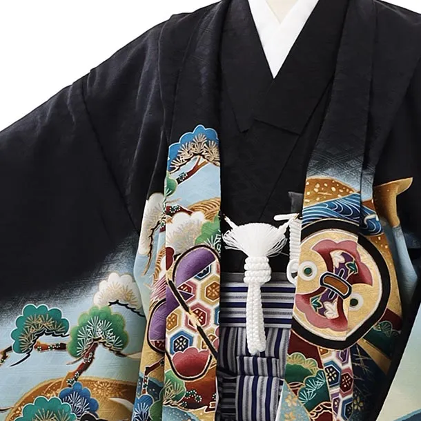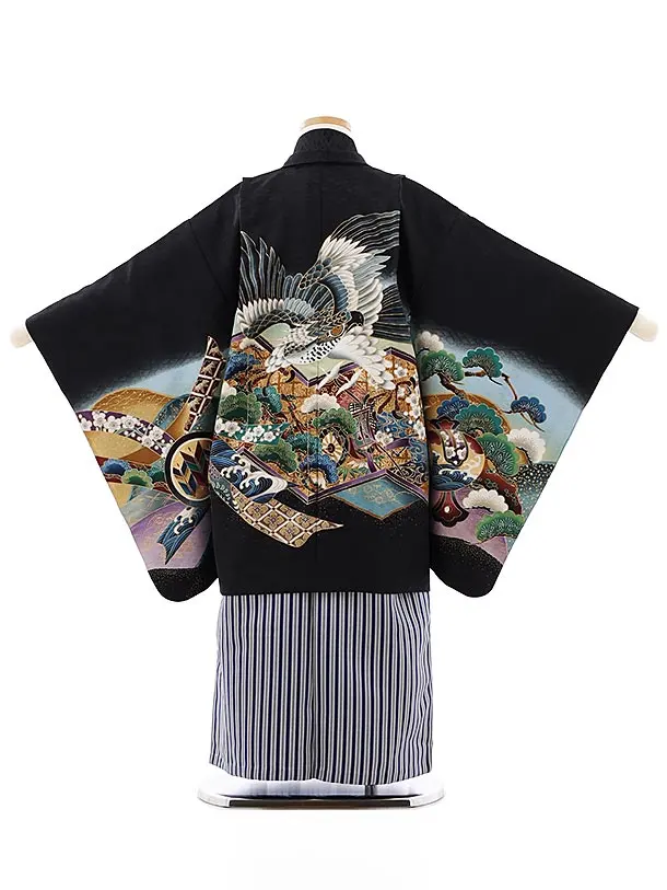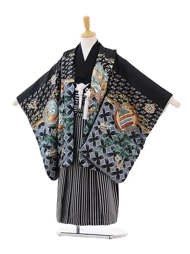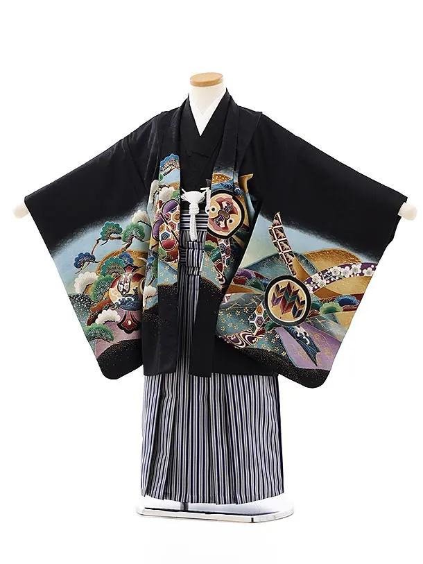 かんたん七五三レンタル(5歳男袴)5833黒地熨斗松兜x紺縞袴