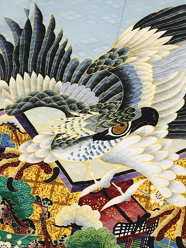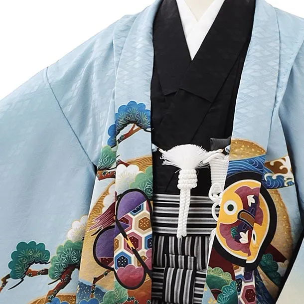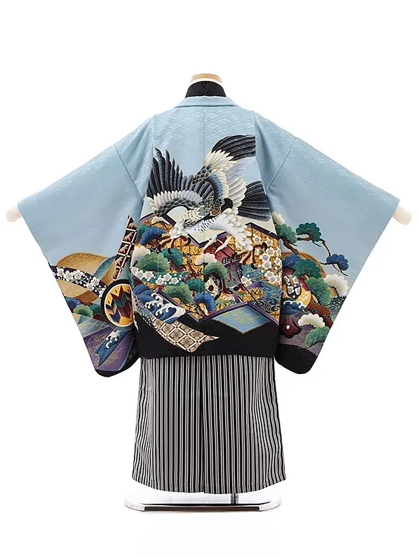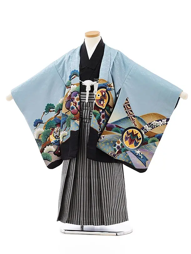 かんたん七五三レンタル(5歳男袴)5835ブルーグレー熨斗松鷹x黒縞袴