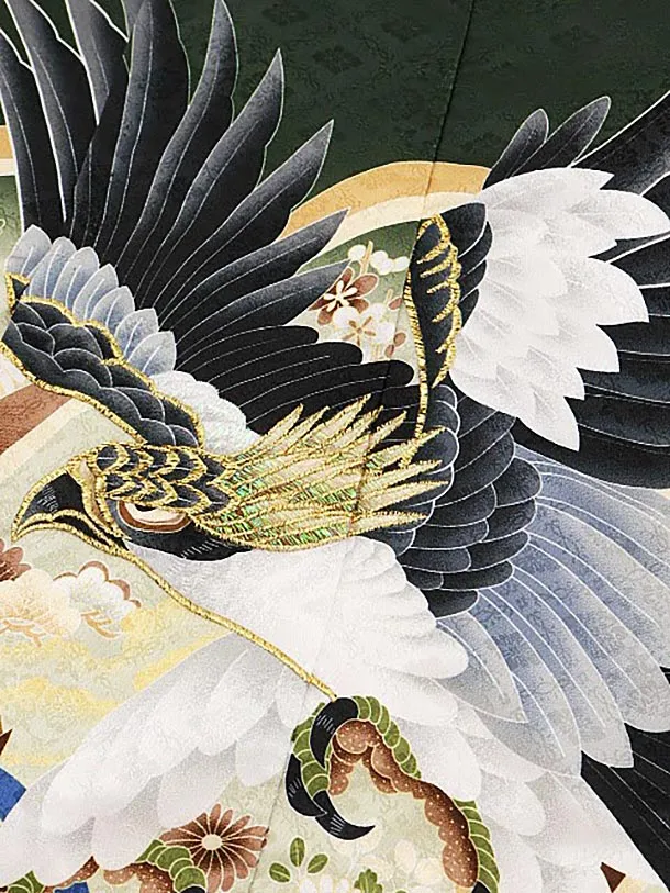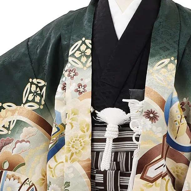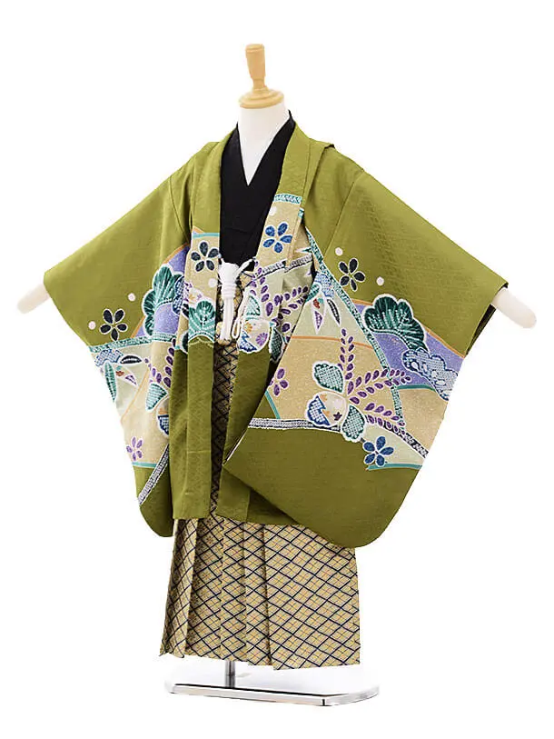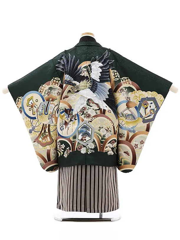 かんたん七五三レンタル(5歳男袴)5841グリーン地丸紋鷹x茶シルバー縞袴