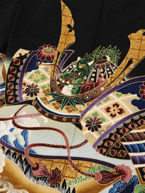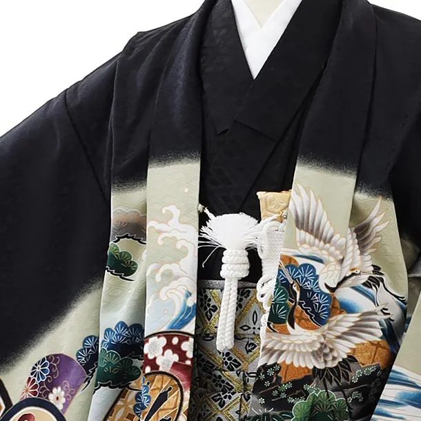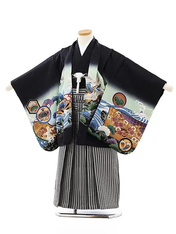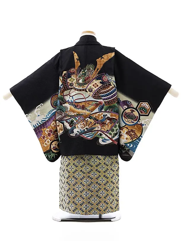 かんたん七五三レンタル(5歳男袴)5855黒地波に兜xうすグリーン菱袴