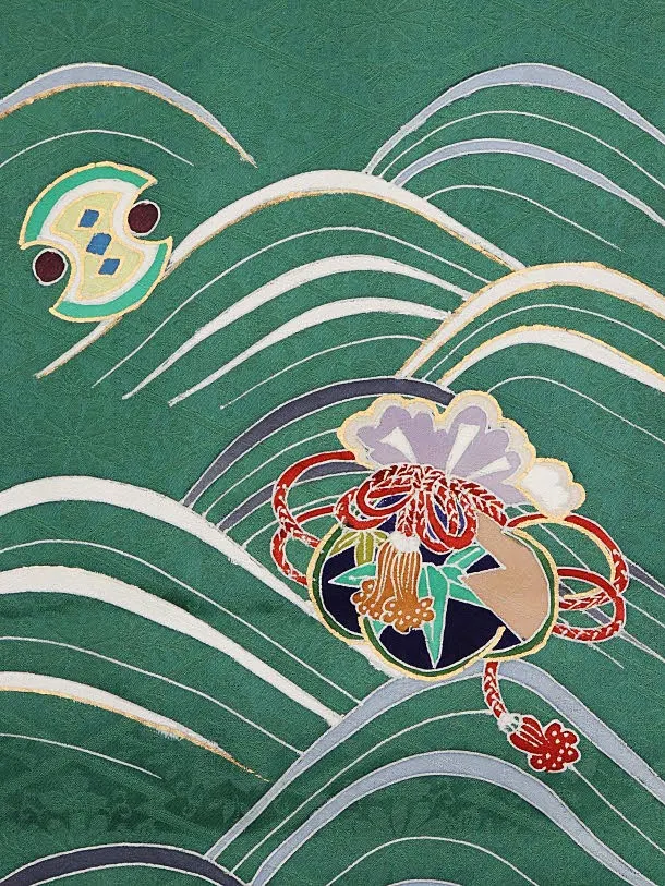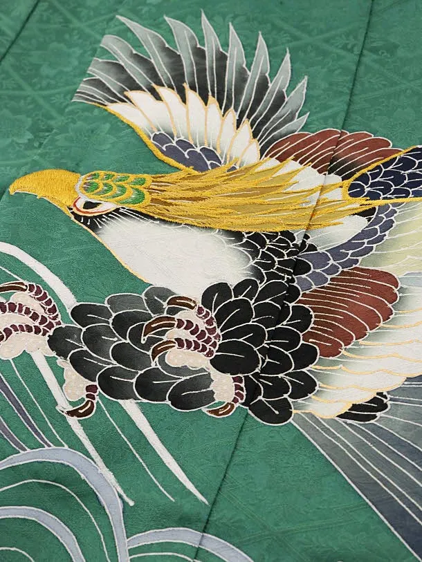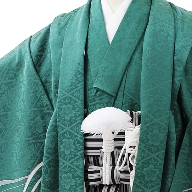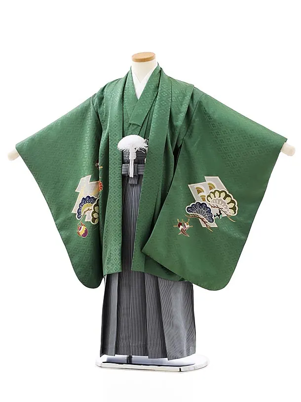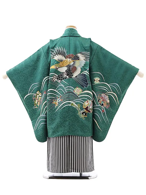 七五三レンタル(5歳男袴)(高級正絹)5860グリーン地波に鷹x黒白縞袴
