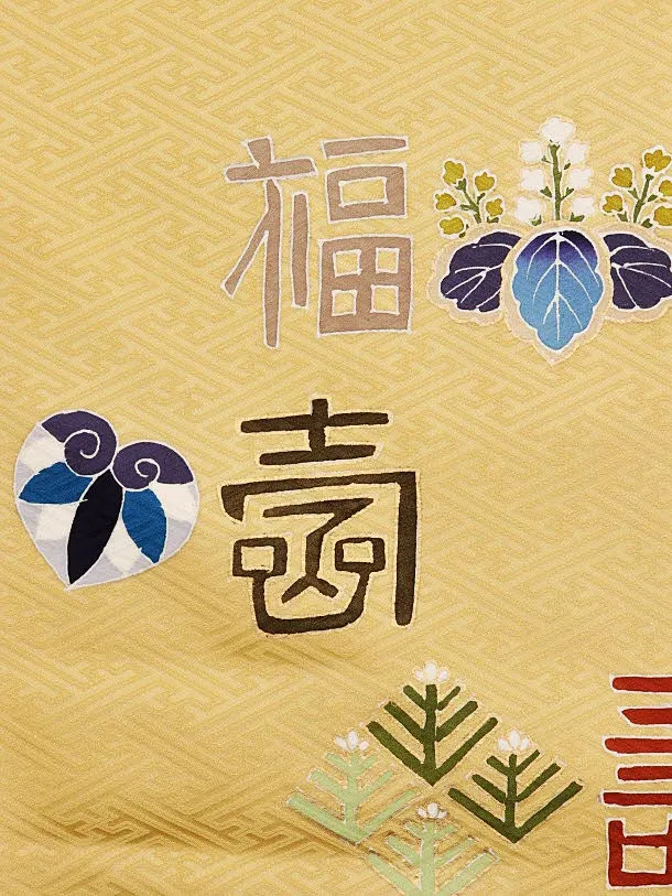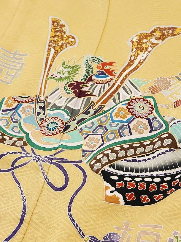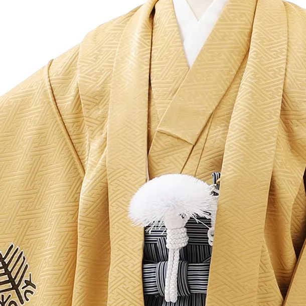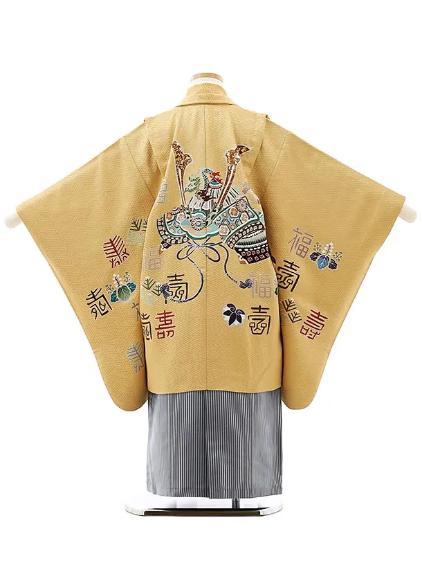 七五三レンタル(5歳男袴)(高級正絹)5863からし色福寿に兜x紺縞袴