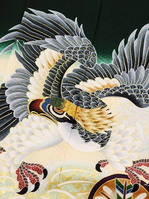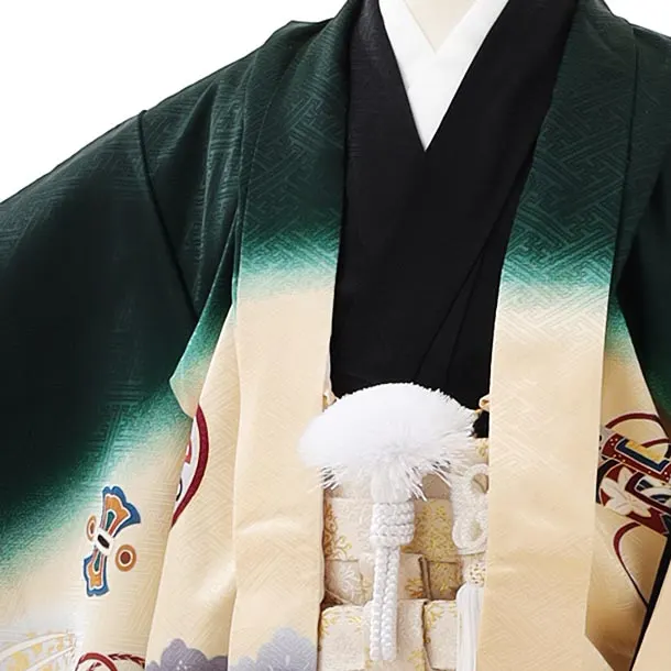 七五三レンタル(5歳男袴)5886【正絹】深緑裾黒丸紋に鷹x白赤茶ぼかし袴
