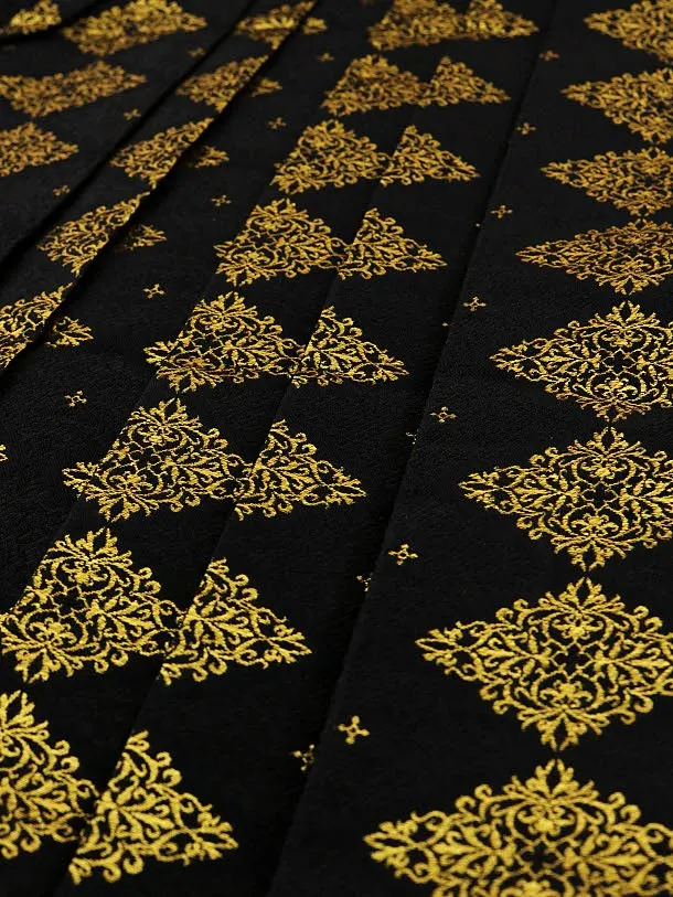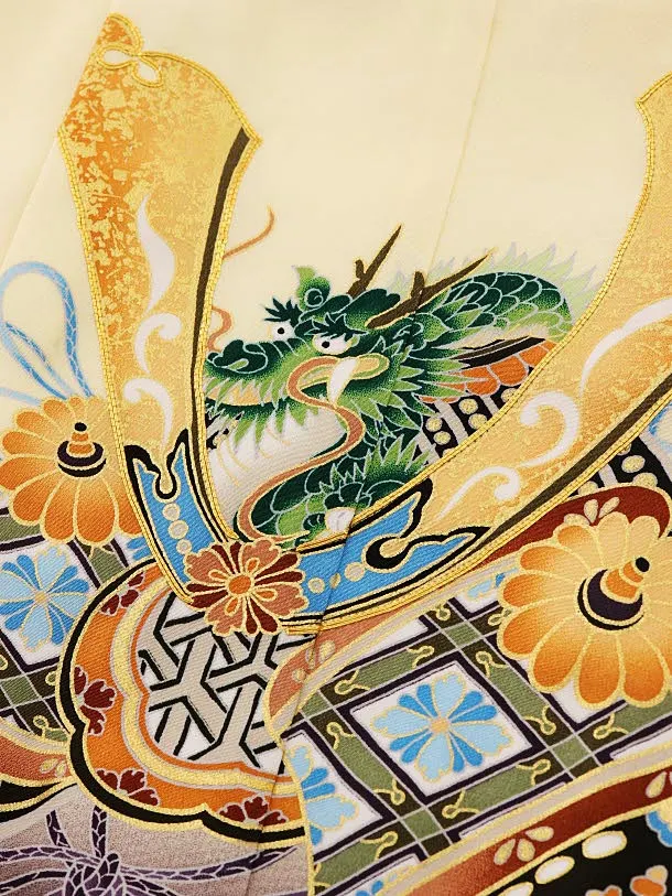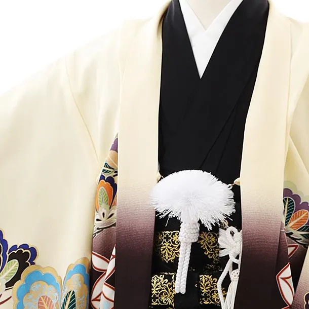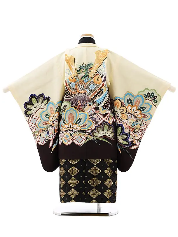 七五三レンタル(5歳男袴)5887【正絹】うす黄色松兜x黒ゴールド袴