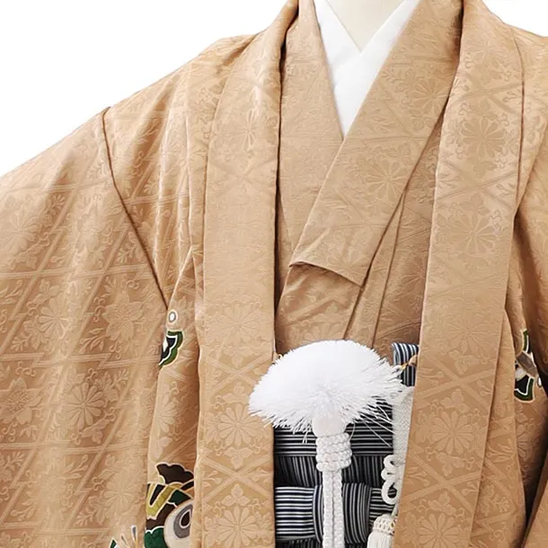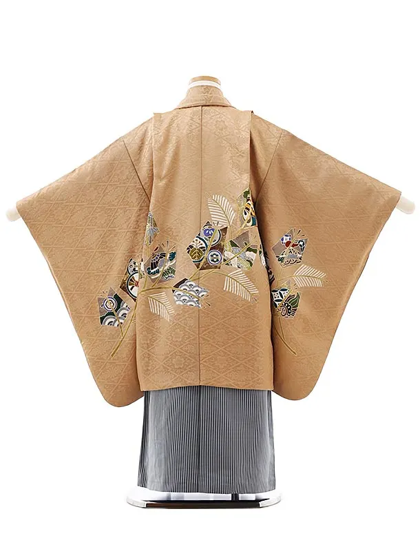 七五三レンタル(5歳男袴)5891(高級正絹)キャメル色松吉祥文様x紺細縞袴