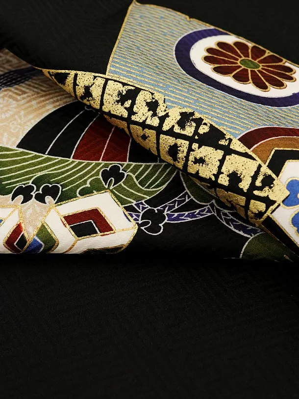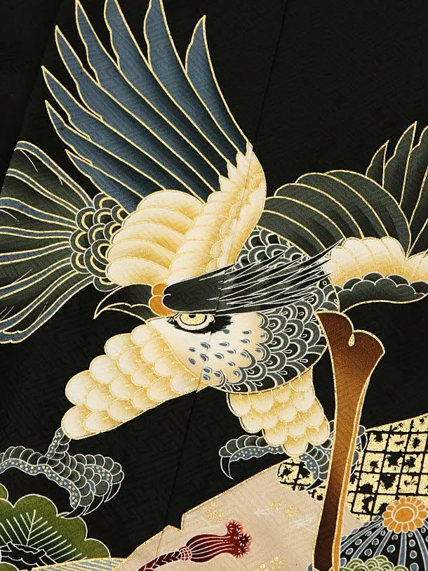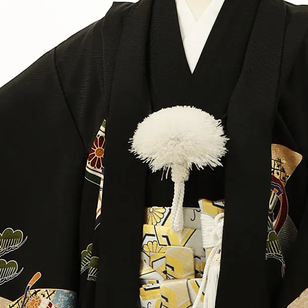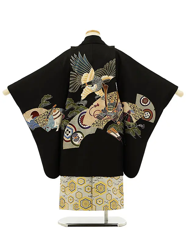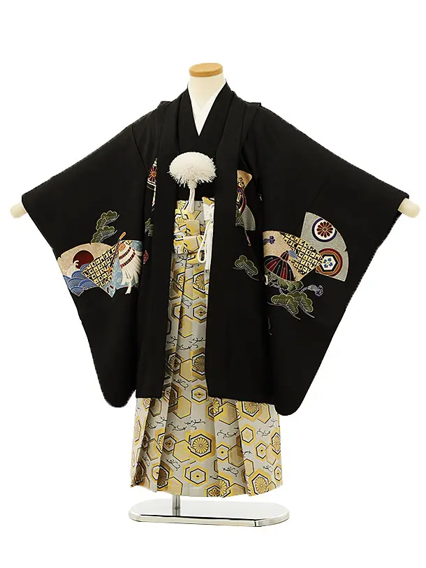 七五三レンタル(5歳男袴)5910(正絹) 黒地扇絵鷹x白金亀甲袴