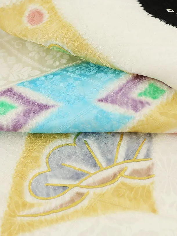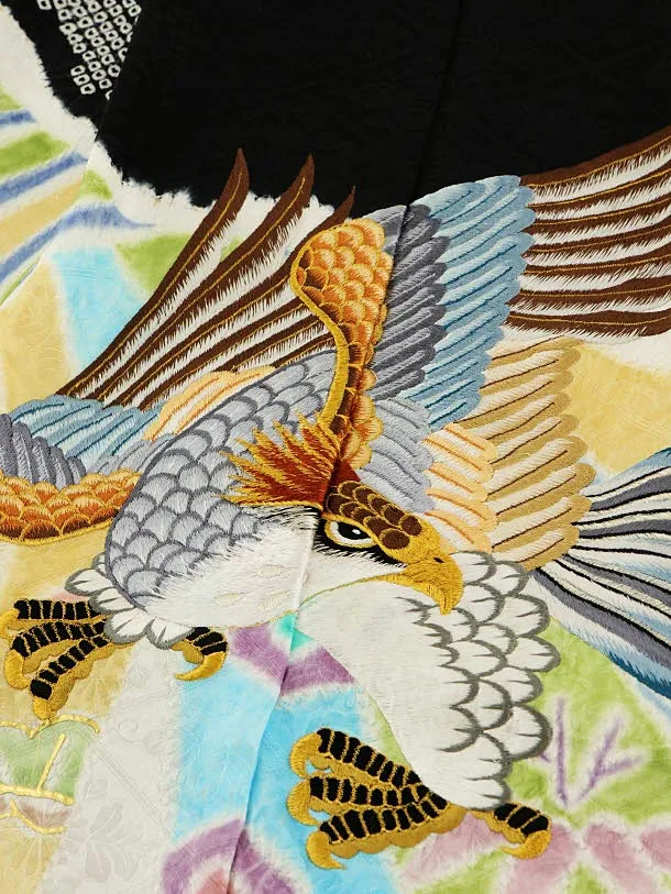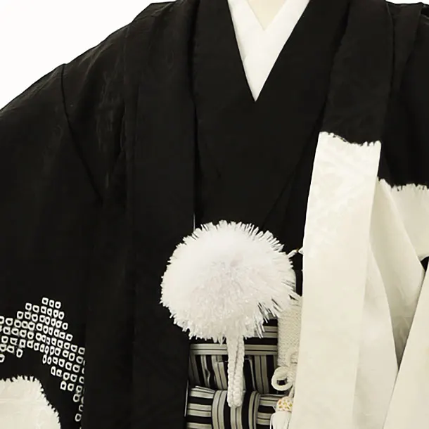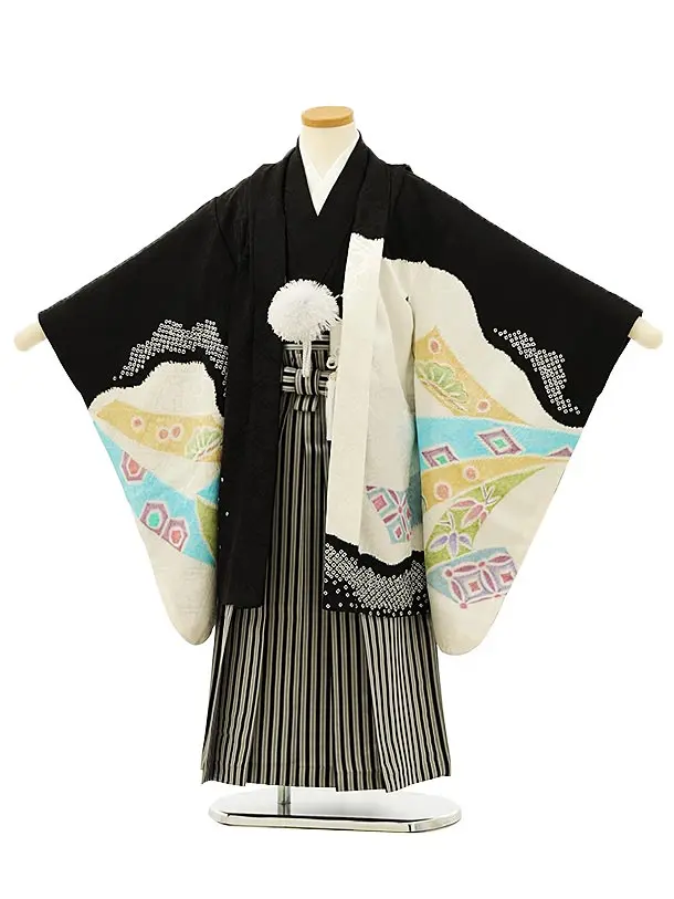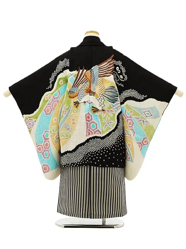 七五三レンタル(5歳男袴)5923【高級正絹】黒白絞り熨斗鷹刺繍x黒縞袴