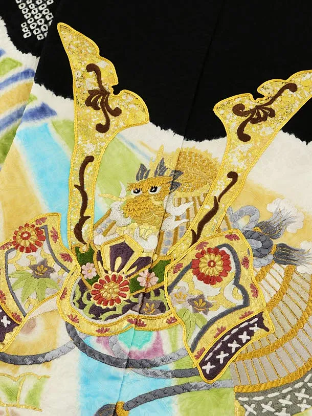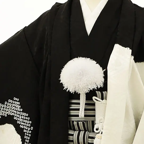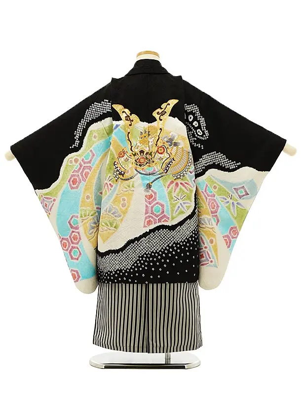 七五三レンタル(5歳男袴)5924【高級正絹】黒白絞り熨斗兜刺繍x黒縞袴