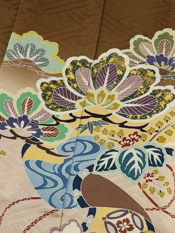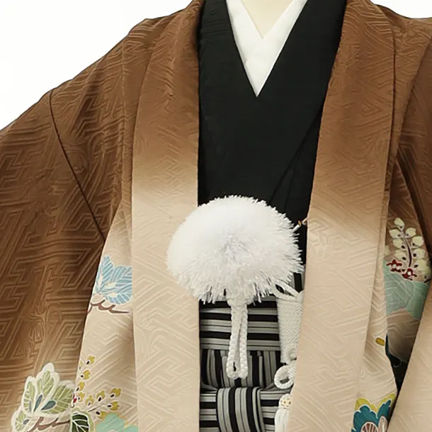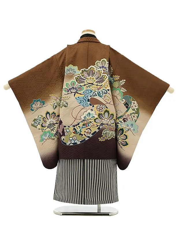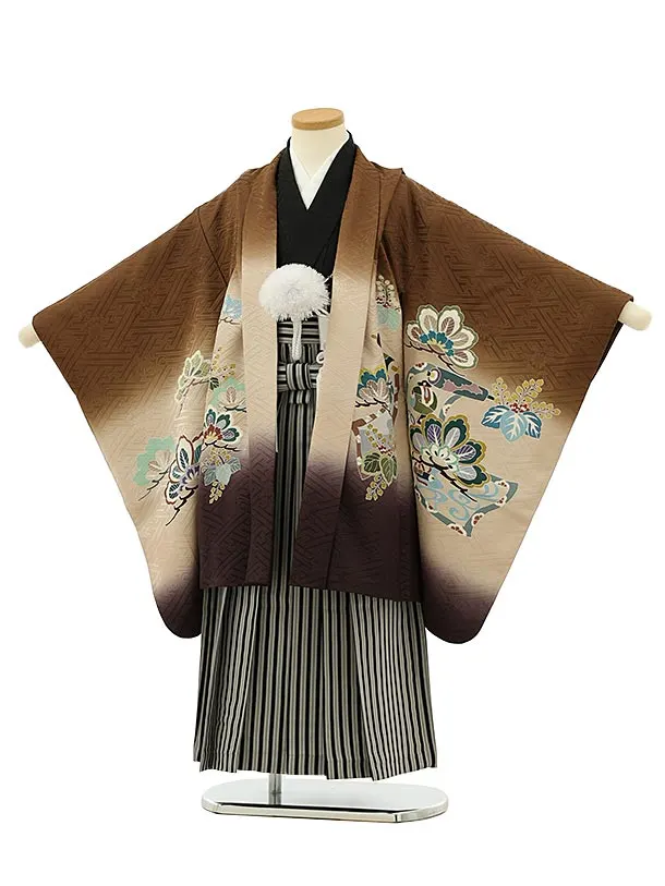 七五三レンタル(5歳男袴)5927【高級正絹】茶色ぼかし松に吉祥巻物x黒縞袴