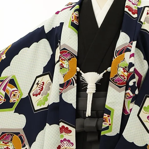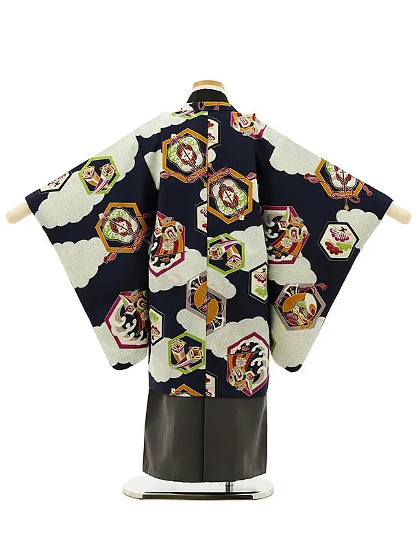 かんたん七五三レンタル(5歳男袴)5960紺雲取り亀甲紋×グレー袴