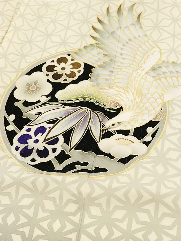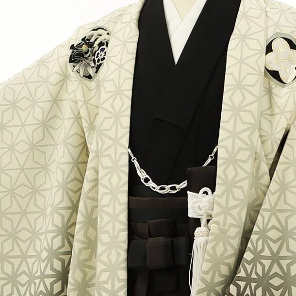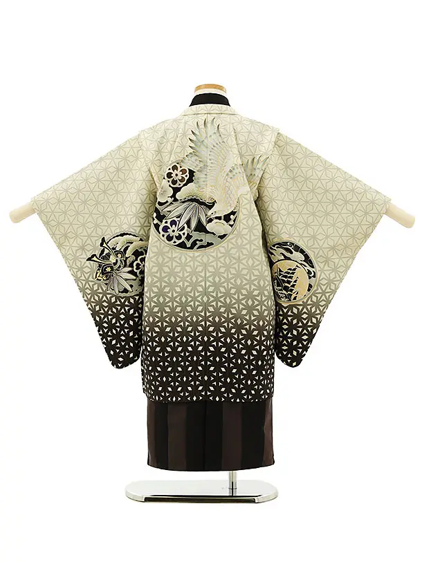 かんたん七五三(5歳男)5962JAPANSTYLEベージュ組子模様に鷹×黒茶袴